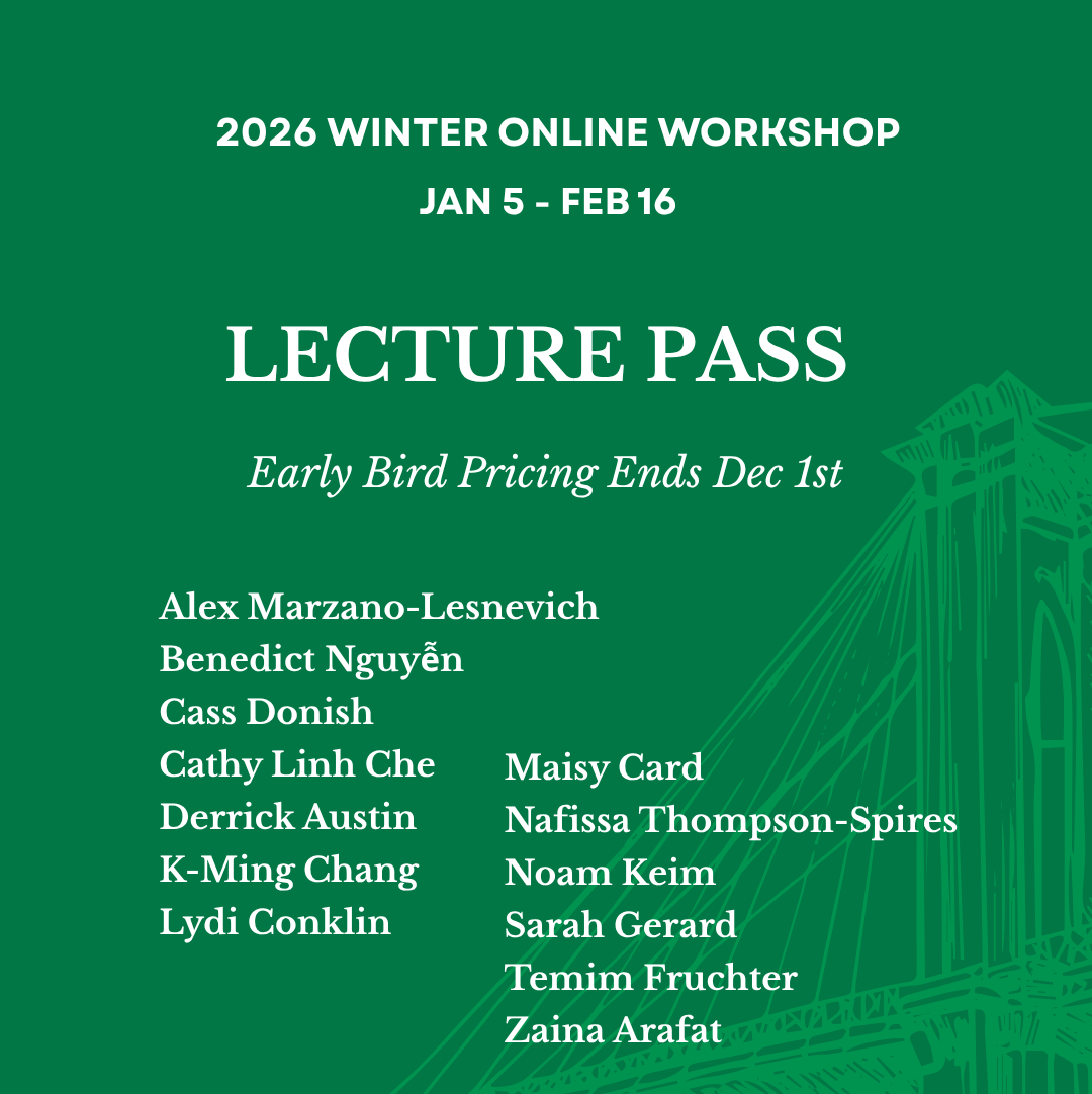 Taught by emerging and established authors from all over the world, our online programming is designed to inspire, spark curiosity, and help writers grow in their practice. Here you’ll find a variety of programming, from one-day intensives and lectures to multi-week seminars and workshops. Classes are held online via Zoom. You do not need a Zoom account in order to participate. All programs are recorded and are available to participants for up to a month after the event. You are welcome to sign up even if you can’t attend live to receive the recording.